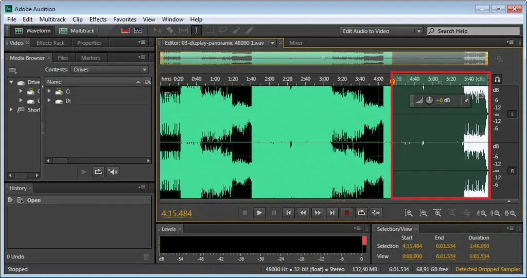 1. Откройте файл в Adobe Audition в режиме формы волны.