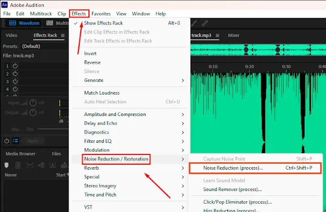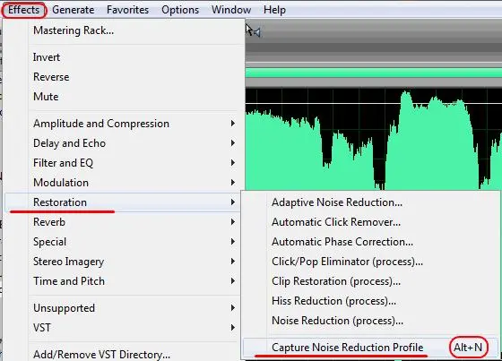3. Перейдите в меню Эффекты (Effects) -> Шумоподавление / Восстановление (Noise Reduction / Restoration) -> Захват шумового отпечатка (Capture Noise Reduction Profile).