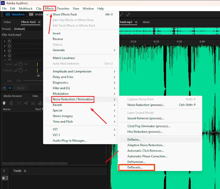 2. Перейдите в меню Эффекты (Effects) -> Шумоподавление / Восстановление (Noise Reduction / Restoration) -> DeReverb.