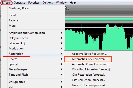 2. Эффекты (Effects) -> Шумоподавление / Восстановление (Noise Reduction / Restoration) -> DeClicker (для постоянных кликов) или Automatic Click Remover (для одиночных).
