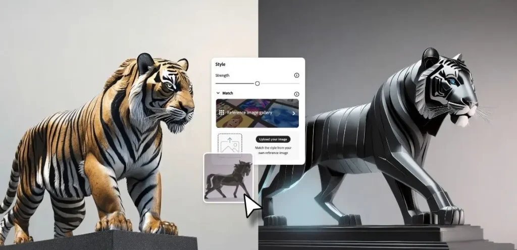 — Применение: Дизайнер может выбрать стиль из библиотеки Adobe или загрузить собственный образец и с помощью ползунка контролировать степень сходства нового изображения с заданным стилем.