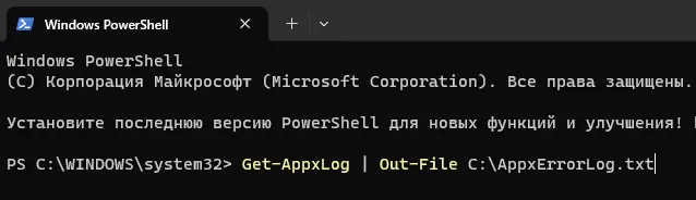 Get-AppxLog | Out-File C:\AppxErrorLog.txt
