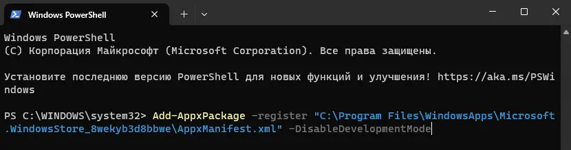 Add-AppxPackage -register "C:\Program Files\WindowsApps\Microsoft.WindowsStore_8wekyb3d8bbwe\AppxManifest.xml" -DisableDevelopmentMode