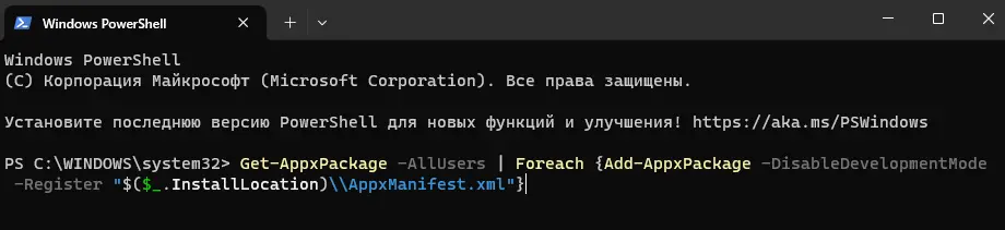 Get-AppxPackage -AllUsers | Foreach {Add-AppxPackage -DisableDevelopmentMode -Register "$($_.InstallLocation)\\AppxManifest.xml"}