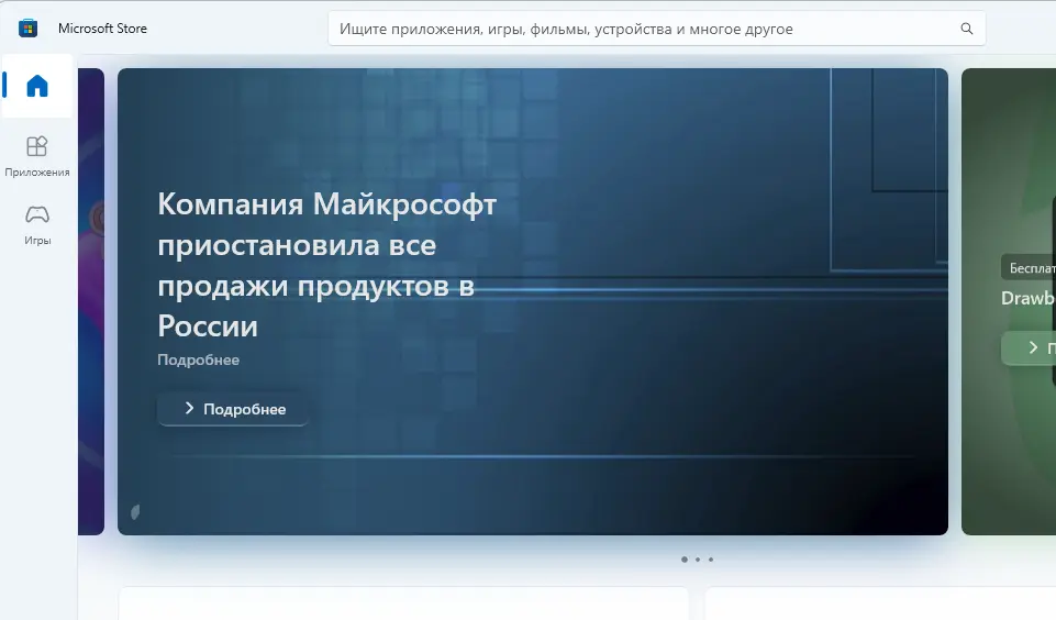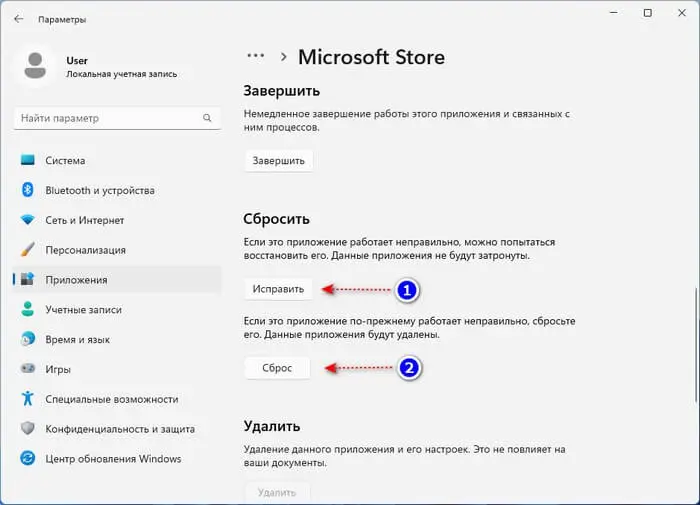 Через меню Параметры → Приложения → Приложения и возможности найдите Microsoft Store → Дополнительные параметры → Сбросить.