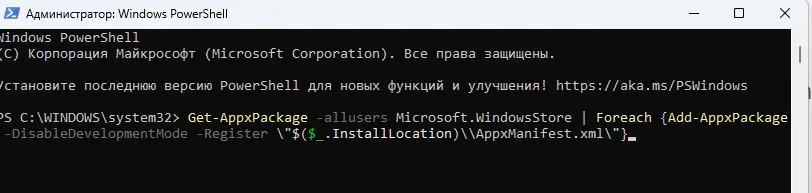 Get-AppxPackage -allusers Microsoft.WindowsStore | Foreach {Add-AppxPackage -DisableDevelopmentMode -Register \"$($_.InstallLocation)\\AppxManifest.xml\"}