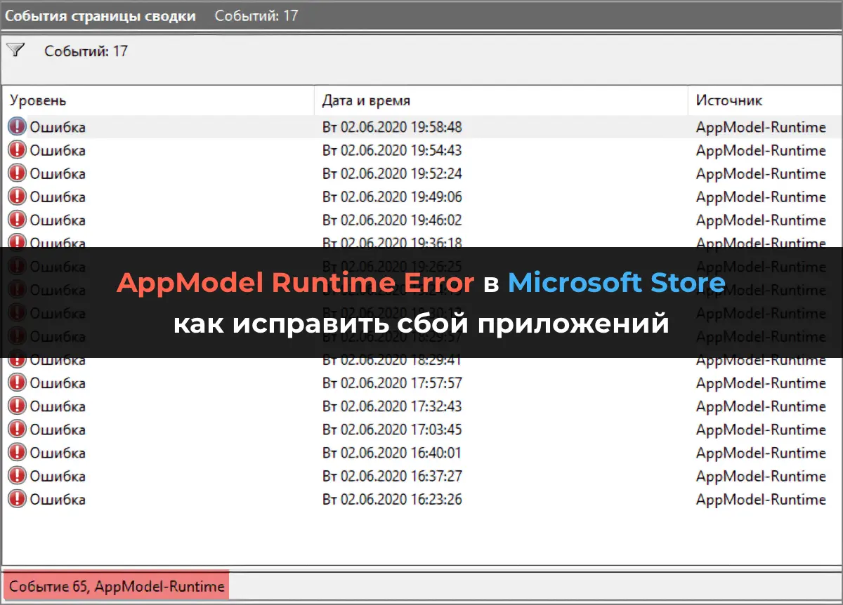 AppModel Runtime Error — это ошибка, с которой пользователи сталкиваются при запуске или обновлении приложений из Microsoft Store. Она часто сопровождается кодами событий 65, 79 или 88 в Журнале событий Windows и может приводить к внезапному завершению работы приложений. В этой статье мы подробно рассмотрим причины появления ошибки и шаги по её устранению.