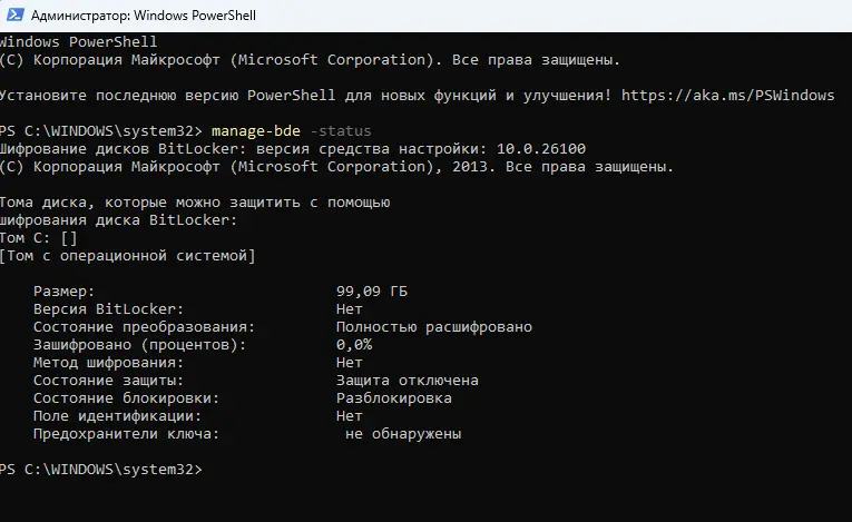 Команда покажет состояние шифрования, тип защиты и наличие TPM/Pluton.