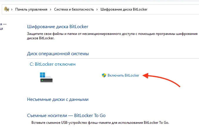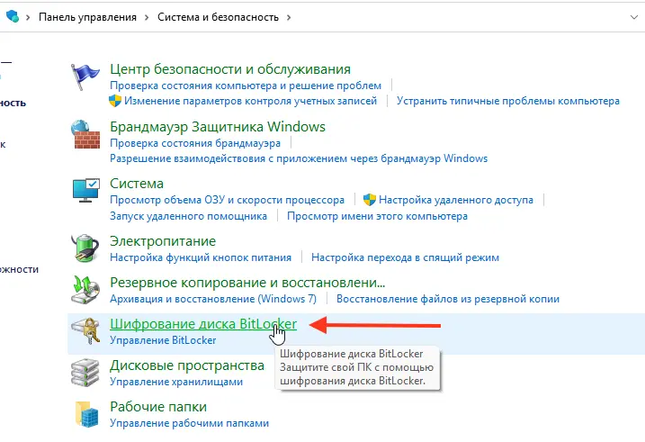 1. Откройте Панель управления → Система и безопасность → Шифрование диска BitLocker.