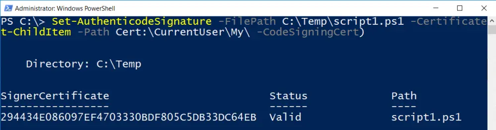 Set-AuthenticodeSignature -FilePath "C:\Scripts\Secure.ps1" -Certificate (Get-Item Cert:\CurrentUser\My\XXXXXXXX)