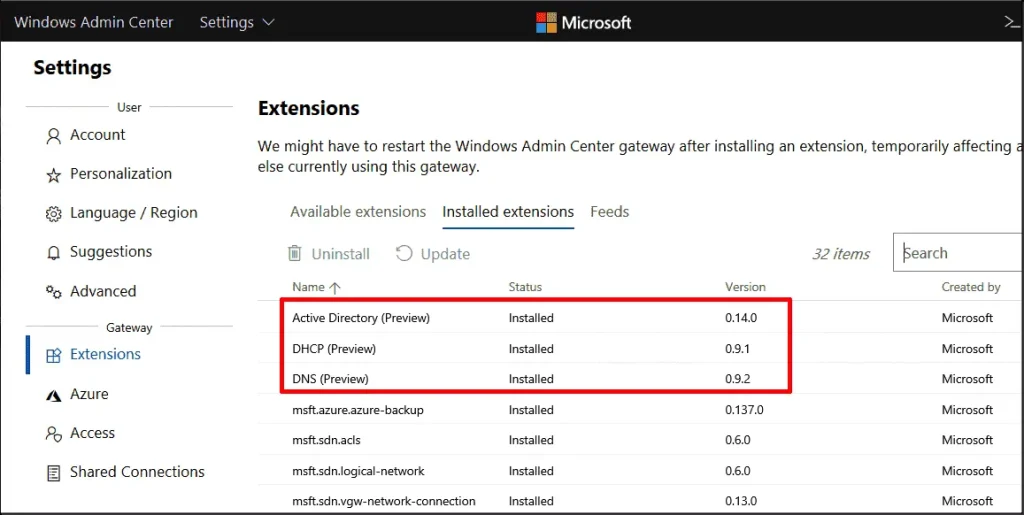 – После установки расширения перезагрузить службу шлюза Admin Center (ServerManagementGateway).