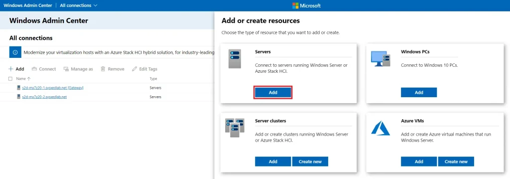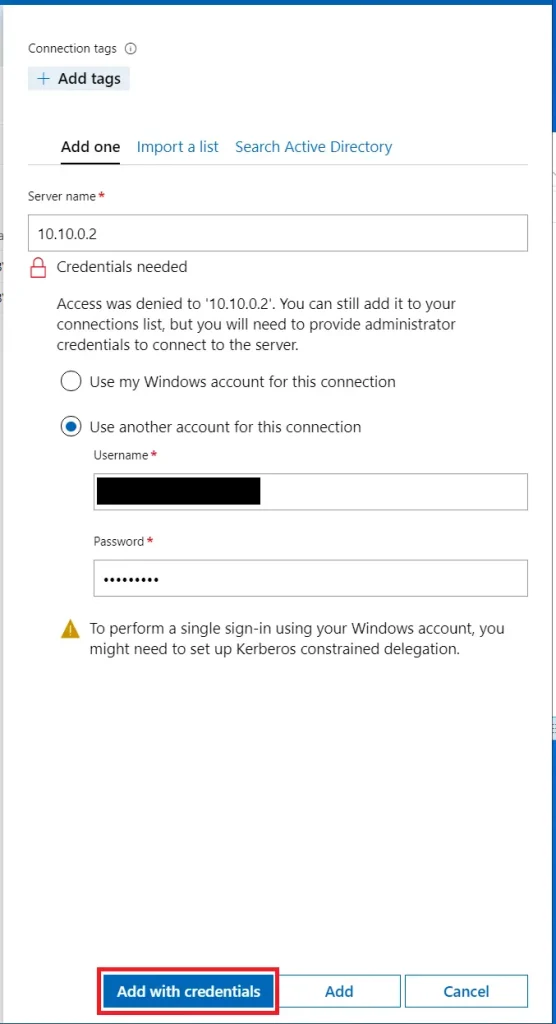 – В интерфейсе Admin Center добавить сервер (Add Server) — указать имя или IP, выбрать учётные данные.