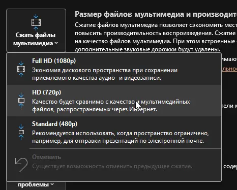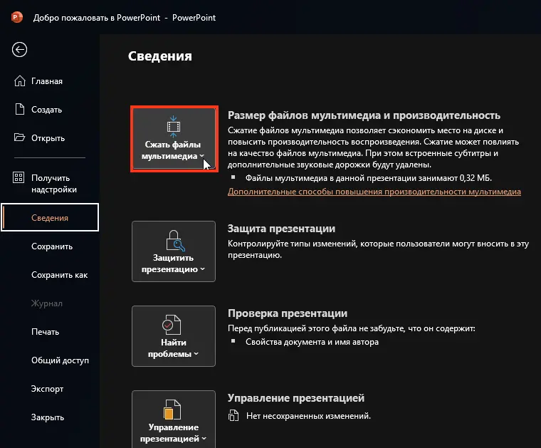 2. Если в презентации есть тяжелое видео, вы увидите кнопку Сжать медиаданные (если видео нет, кнопка не отобразится).