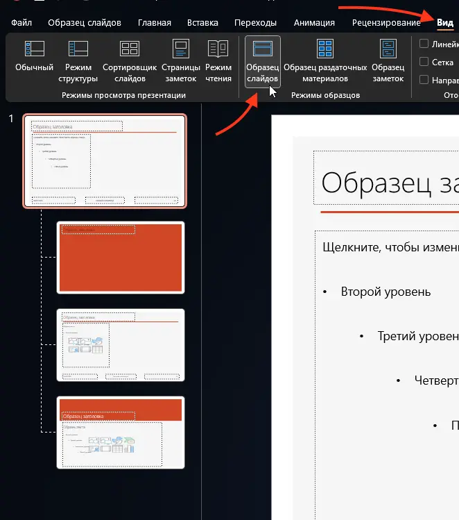 1. Перейдите во вкладку Вид и выберите Образец слайдов.