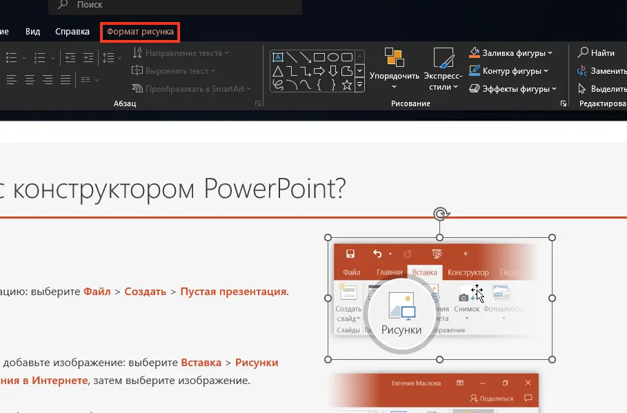 2. Перейдите во вкладку Формат рисунка (она появляется в верхней панели при выделении изображения).
