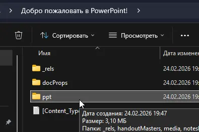 — Данные редактирования изображений (например, обрезанные части картинок, которые PowerPoint хранит «на всякий случай»).