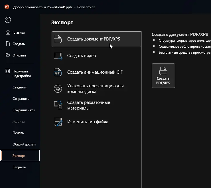 1. Файл -> Экспорт -> Создать документ PDF/XPS.