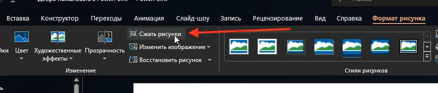 3. Найдите в группе «Изменение» кнопку Сжать рисунки.