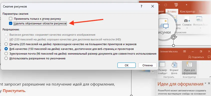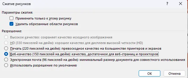 6. Выберите подходящее разрешение. Для большинства случаев идеально подходит вариант «Веб (150 пикс/дюйм)» — это обеспечит отличный вид на мониторах и проекторах. Если же презентация предназначена только для просмотра на ноутбуке, можно выбрать «Электронная почта (96 пикс/дюйм)».