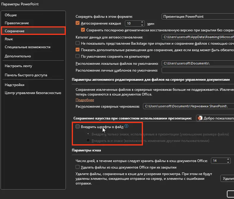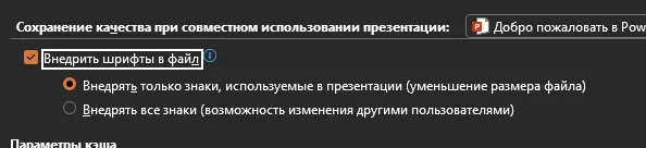 4. Если галочка «Внедрить шрифты в файл» стоит, попробуйте её снять.