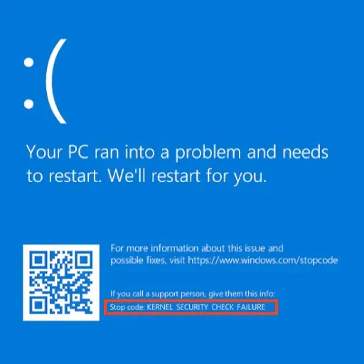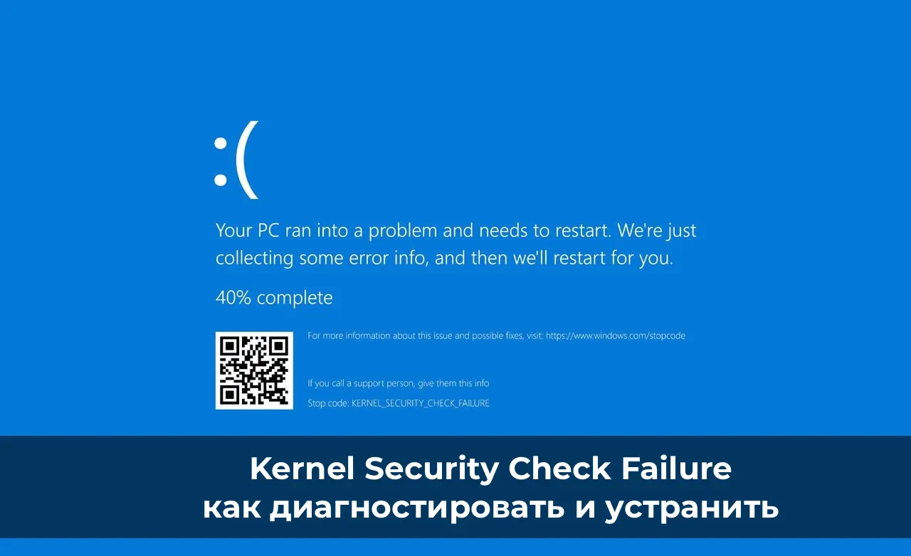 Ошибка Kernel Security Check Failure сопровождается синим экраном (BSOD) и указывает на критическую проблему в ядре Windows. Обычно она появляется при сбое проверки целостности данных ядра — Windows обнаруживает несоответствие между ожидаемыми и фактическими данными, что приводит к аварийному завершению работы.