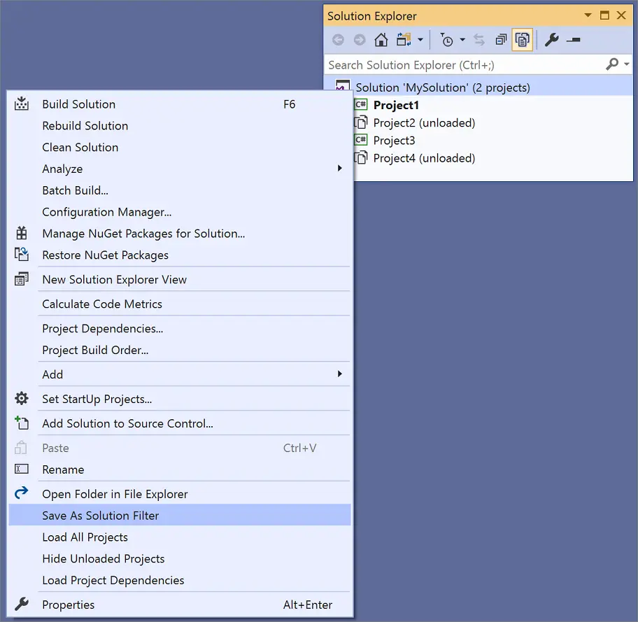 – Используйте Solution Filters, чтобы открывать только часть решения.