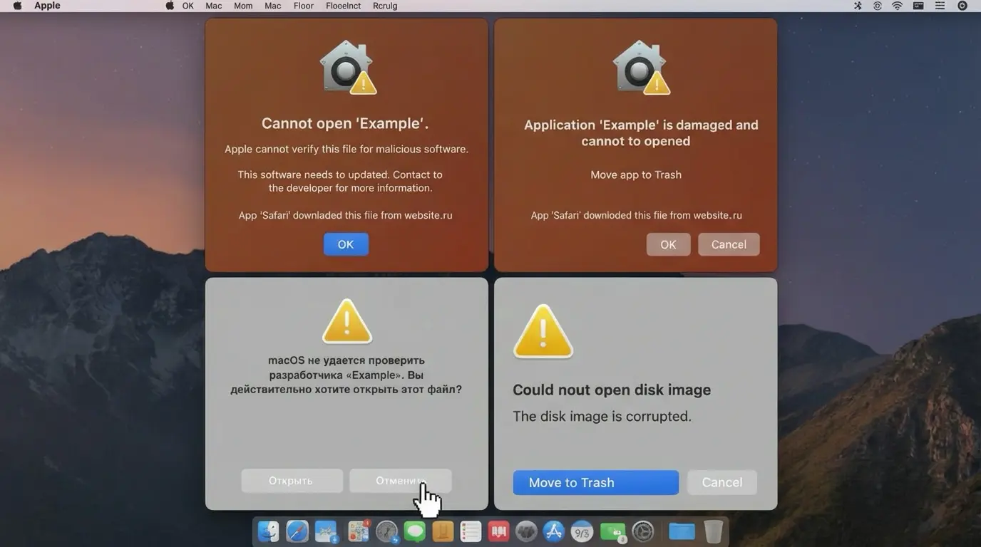 Важно понимать: в 99% случаев файл не поврежден. Это защитный механизм macOS (карантин), который срабатывает, если система видит модификации в коде или просто не может проверить подпись из-за отсутствия интернета или устаревших сертификатов.