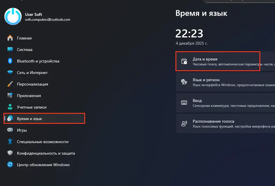 1. Перейдите в «Параметры» -> «Время и язык» -> «Дата и время».