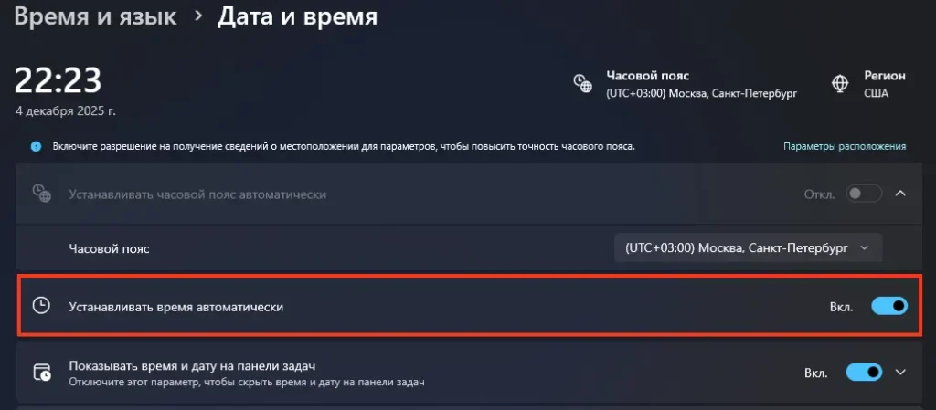 2. Убедитесь, что переключатель «Установить время автоматически» включен.