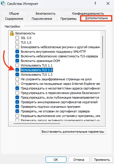 Также, если вы используете Windows 10/11, убедитесь, что в «Свойствах браузера» (Internet Options) включены протоколы TLS 1.2.