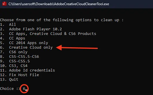 3. В консольном меню выберите очистку только Creative Cloud Desktop (обычно это пункт 6, внимательно читайте меню). Не выбирайте «Clean All», если не хотите переустанавливать все программы Adobe.