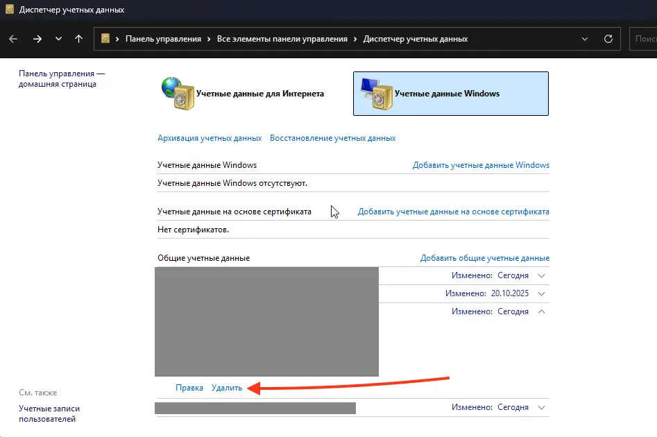 Способ 3: Очистка диспетчера учетных данных (Credential Manager)