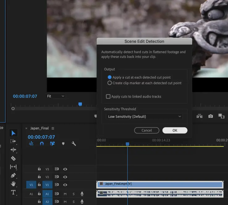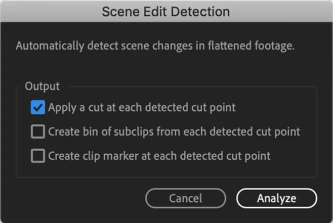— Применить нарезки к каждому обнаруженному кадру: Premiere Pro автоматически добавит точки монтажа (cuts) в начале каждой новой сцены.