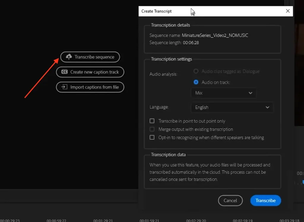 2. Запуск: Нажмите «Transcribe Sequence» (Транскрибировать эпизод). Выберите нужный язык (доступна поддержка русского и многих других языков).