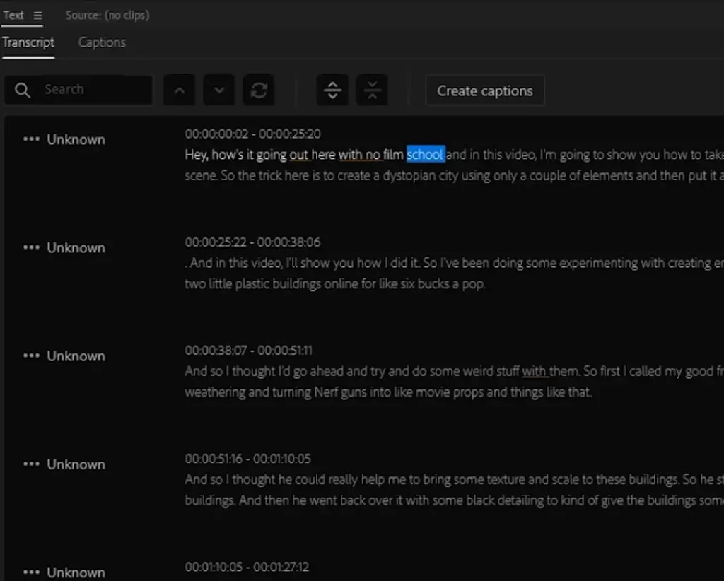 3. Создание субтитров: После завершения транскрипции (она происходит очень быстро благодаря ИИ Sensei), нажмите «Create Captions» (Создать субтитры). Premiere Pro автоматически создаст дорожку субтитров, разбитых на сегменты с правильным таймингом.