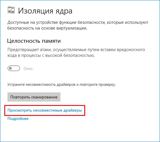 — Если обновления нет, драйвер, возможно, придется удалить. Для этого в том же окне сведений об изоляции ядра нажмите на несовместимый драйвер, чтобы увидеть его имя, и затем используйте «Диспетчер устройств» для его удаления.