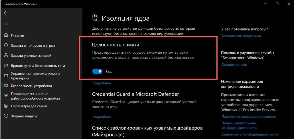 Как включить Core Isolation (Целостность памяти) в Windows 11?
