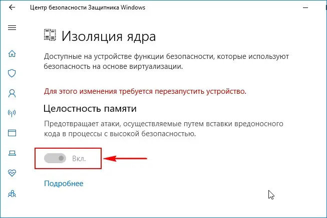 1. Перейдите в «Безопасность Windows» -> «Безопасность устройства» -> «Сведения об изоляции ядра».