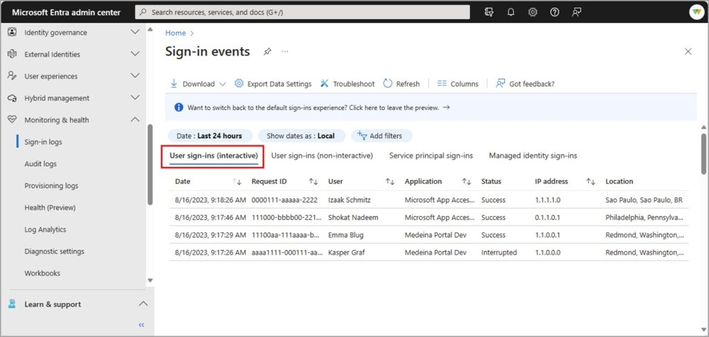 2. Нажмите «Журналы входа» (Sign-in logs).