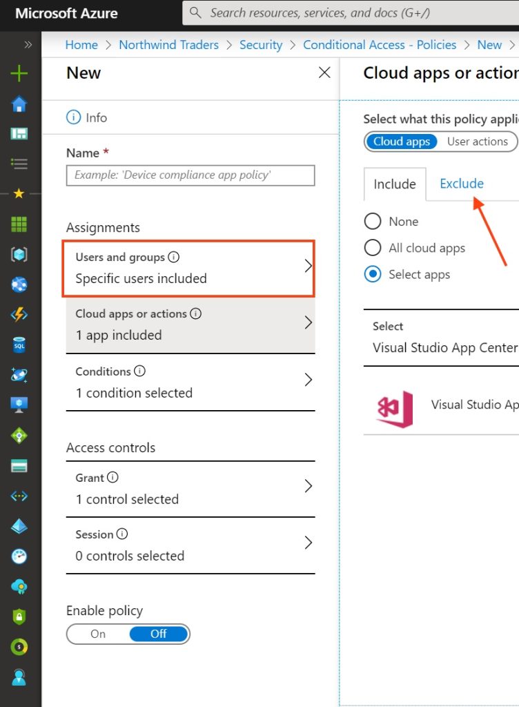 Критически важно: Во вкладке «Исключить» (Exclude) обязательно добавьте вашу учетную запись администратора «Break-glass» (аварийного доступа). Если вы настроите политику неправильно и примените её ко всем, вы можете потерять доступ к админке навсегда.