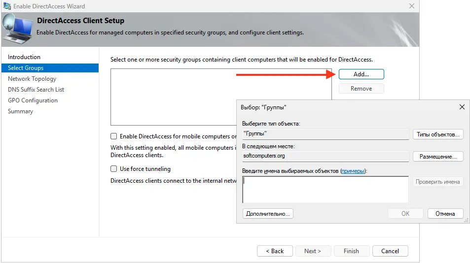 — Добавьте созданную вами заранее группу безопасности (например, `DA_Laptops`), в которую вы включили учетные записи компьютеров (не пользователей!).