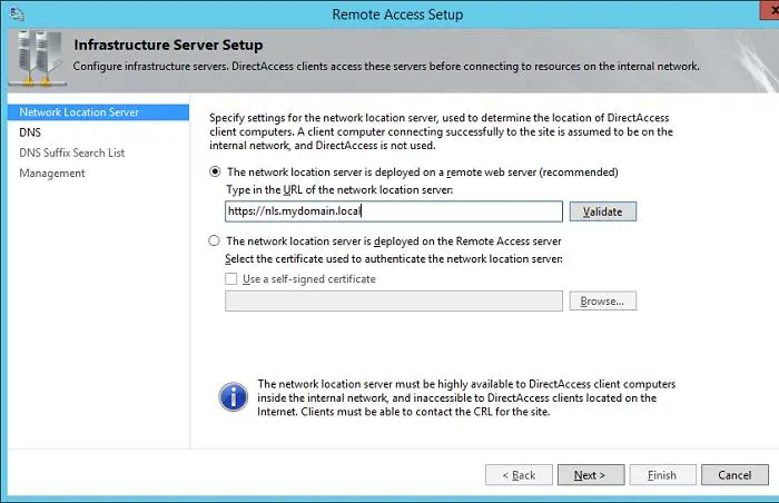 Мастер предложит разместить NLS на самом сервере DirectAccess. Не делайте этого, если планируете отказоустойчивость. Для простых инсталляций это допустимо.
