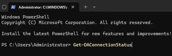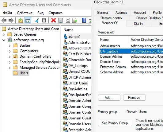 После применения настроек вы должны добавить компьютер клиента (Windows 10/11 Enterprise) в группу безопасности `DA_Laptops` и выполнить `gpupdate /force` внутри офисной сети. Клиент должен получить настройки GPO.