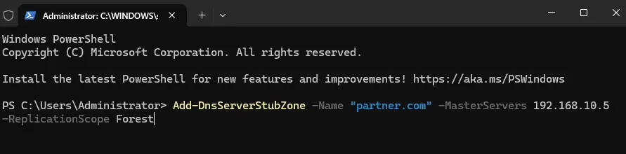 Add-DnsServerStubZone -Name "partner.com" -MasterServers 192.168.10.5 -ReplicationScope Forest