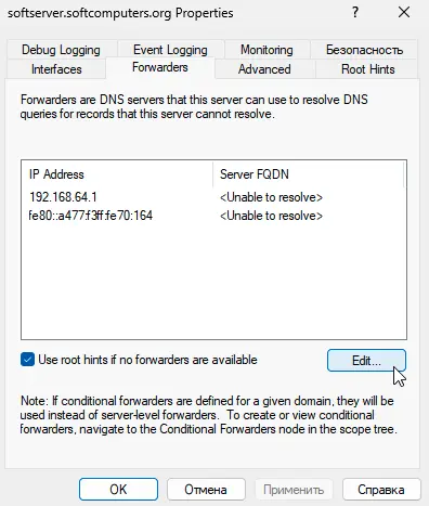 Важно: Если вы не настроите Forwarders, сервер автоматически переключится на использование Root Hints. Это рабочий, но более медленный вариант.