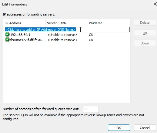 Forwarders — это список внешних DNS-серверов (обычно это DNS вашего провайдера или публичные серверы вроде 1.1.1.1 или 8.8.8.8), на которые ваш контроллер домена перенаправляет все запросы, которые он не может разрешить локально.