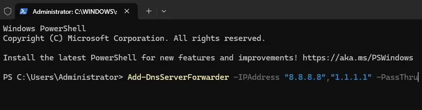 Add-DnsServerForwarder -IPAddress "8.8.8.8","1.1.1.1" -PassThru