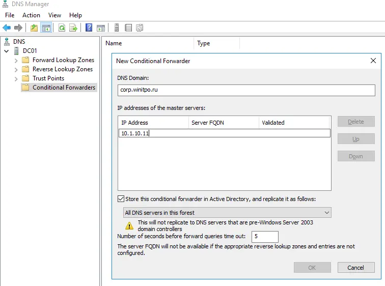Conditional Forwarder: Ручное. IP-адреса прописываются статично.