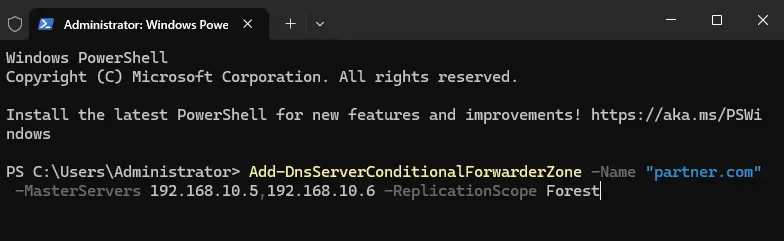 Add-DnsServerConditionalForwarderZone -Name "partner.com" -MasterServers 192.168.10.5,192.168.10.6 -ReplicationScope Forest