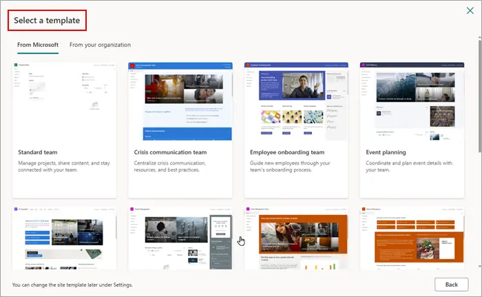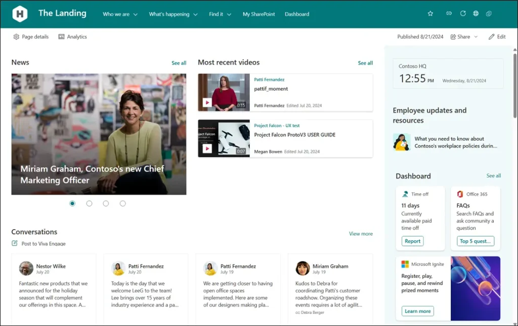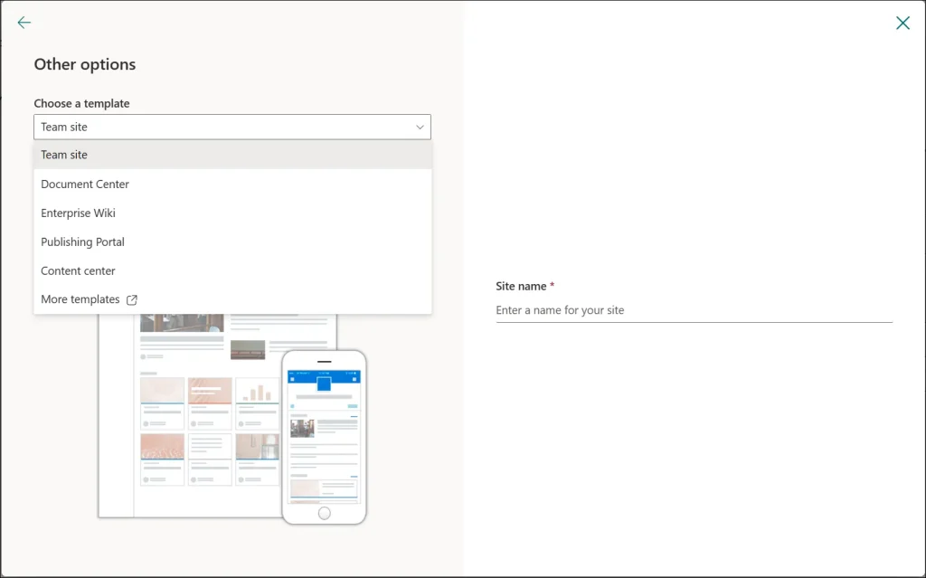 Рекомендация: Для создания главного интранет-портала компании, где публикуются новости и HR-информация, используйте Сайт для общения. Для рабочих отделов и проектов — Сайт группы.